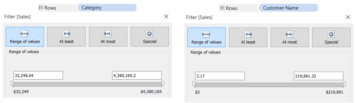 Terwijl het filteren van Sum([Sales]) met Customer Name in de view resulteert in een range van $3 tot $219,891