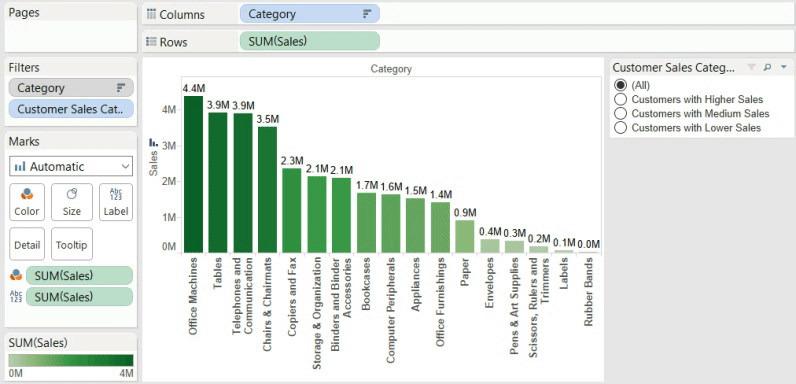 In dit geval kunnen we de calculatie als een filter toevoegen aan de sheet om sales by Category te visualiseren. Dit geeft de mogelijkheid om de viz te filteren op elke category van de customer sales. Om hier verder op voort te bouwen kunt u nu verschillende visualisaties maken en beginnen met analyseren op een interactieve en dynamische manier.