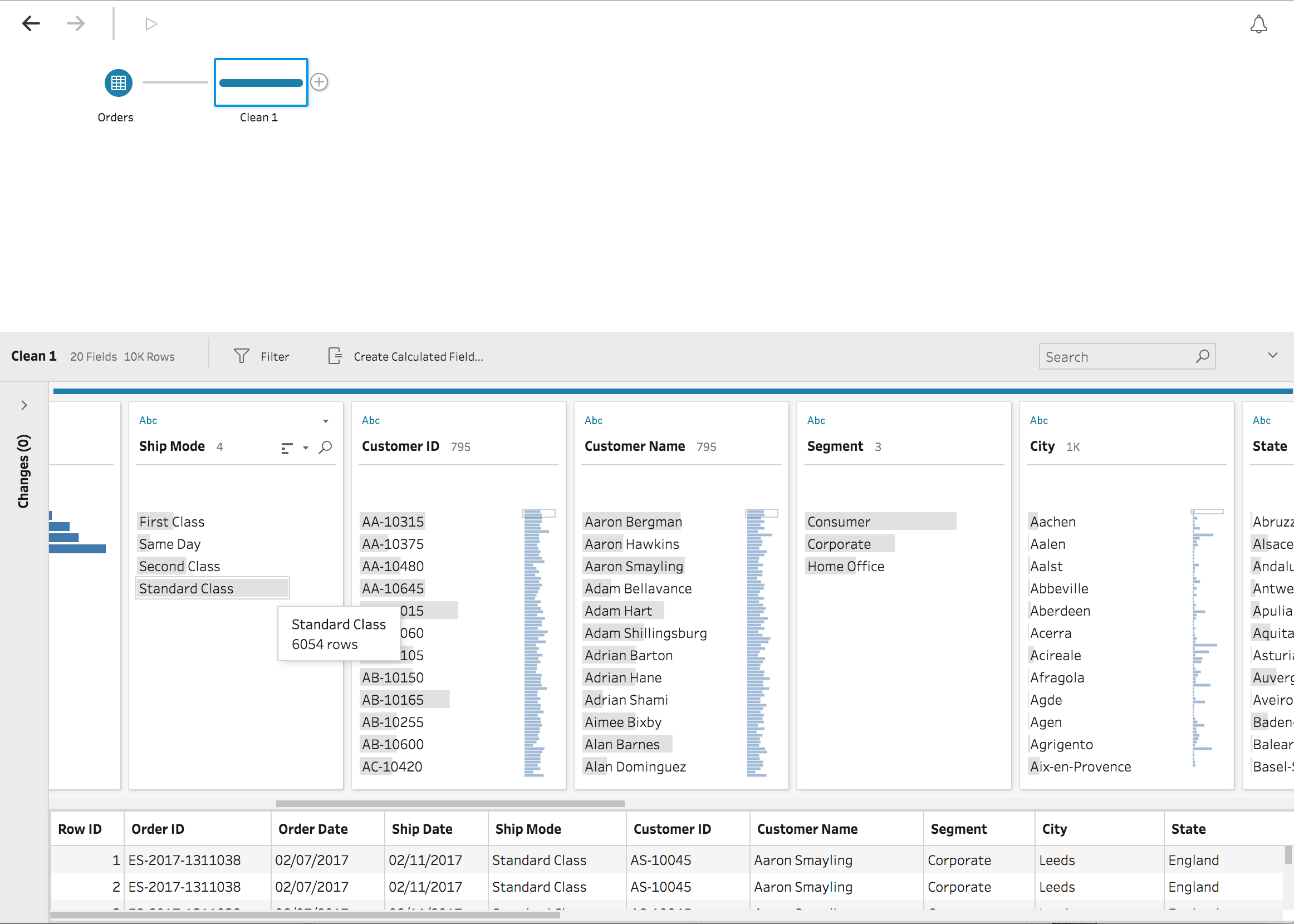 Aan de linkerkant heb je de data connecties. Bovenin het scherm zie je de workflow en onderin de records. In het midden de inhoud van de databron – Tableau noemt dit de profiles. Je ziet hier direct de vorm van je data, zoals lege velden, outliers, vullingsgraad, spelfouten etc. Zie bijvoorbeeld hoe de verschillende shipping modes zich tot elkaar verhouden. In onderstaand voorbeeld zie je direct dat ‘Standard Cases’ veel vaker voorkomen dan de andere opties. Klik op een optie en Maestro laat je de relatie tot andere velden zien.