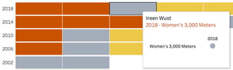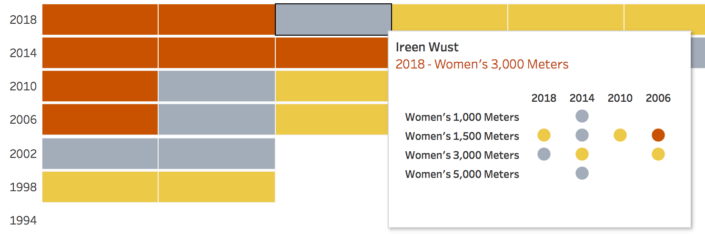 By default, the viz in tooltip is filtered on “All Fields”, so when I hover over “Ireen Wust” in 2018, I see only her medal won this year in the Tooltip.