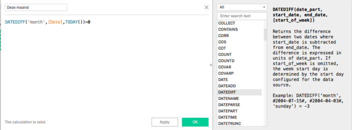 Je wilt dus de huidige maand uitsluiten. Dit is vrij eenvoudig. Maak een Calculated Field en gebruik de DataDiff functie – zie hieronder. De Today() functie geeft de datum van vandaag, en [Date] is de datum van de pageviews. De ‘month’ is de Date Part. De vergelijking moet in dit geval de uitkomst nul geven, dus de maand van de pageviews is gelijk aan de maand van vandaag.