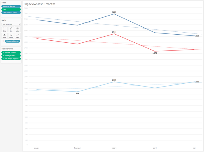 Vervolgens sleep je dit nieuwe veld, die je bv de naam ‘Deze maand’ geeft, in de Filters mark. Je wilt deze maand uitsluiten dus je selecteert False in je filter. Je krijgt nu een grafiek waarbij de huidige maand is uitgesloten. Dat ziet er alweer een stuk beter uit:-)