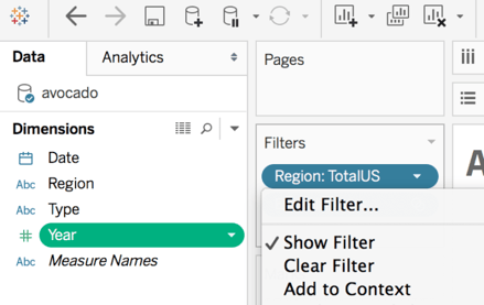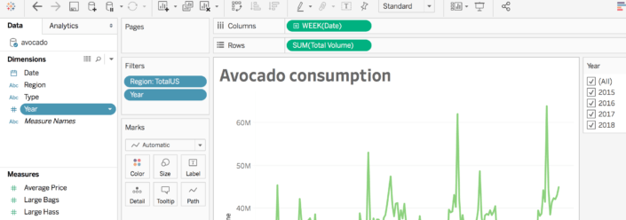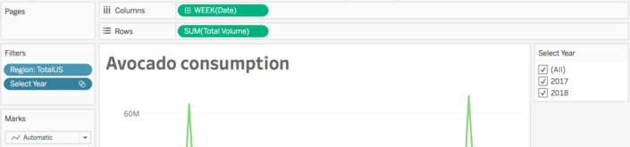 In onderstaande view wordt de avocadoconsumptie van de afgelopen vier jaar getoond. Stel dat je ervoor wilt zorgen dat de gebruiker zich focust op de afgelopen twee jaar. Ofwel, je wilt 2015 en 2016 uitsluiten van de filter.