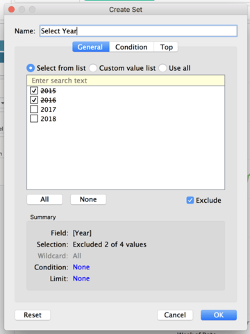 Stap 2: Exclude de jaren 2015 en 2016, geef de set een informatieve naam en klik op “Ok”