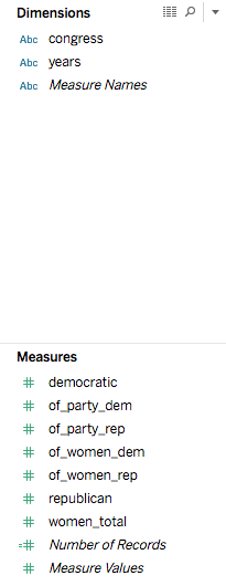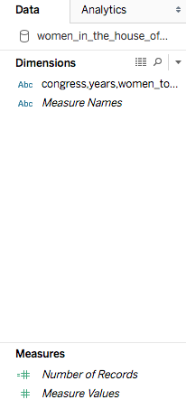 Ook wanneer er bij ‘Sheet 1’ gekeken wordt, zul je zien dat er meerdere ‘Dimensions’ en ‘Measures’ weergegeven worden: