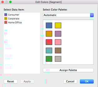 Sla het gewijzigde Preference.tps op en herstart Tableau. Je custom kleurenpalet is nu klaar voor gebruik. Afhankelijk van het type palet, sleep je een dimension of measure naar “Color” op de marks card. Klik met je rechtermuisknop op de color-card en kies “Edit Colors”. Je custom kleurenpalet verschijnt nu in het dropdown-menu onder “Select Color Palette”. Selecteer je eigen palet, kies “Assign Palette” en klik op “OK”.
