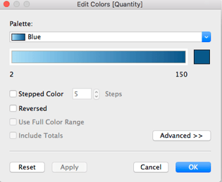 - Een “sequential” kleurenpalet, te gebruiken voor numerieke data, waarbij de intensiteit van de kleur de hoogte van de waarde aangeeft.