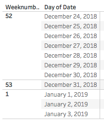Deze situatie wordt veroorzaakt door een verschil in datumdefinitie. Tableau werkt met de Amerikaanse methode voor weeknummering. Een nieuwe week start op zondag en de eerste week van een nieuw jaar beslaat de periode van 1 januari tot de eerste zaterdag die daarop volgt. In Europa doen we dat net iets anders. We volgen de internationale standaard ISO 8601 voor datum en tijd. Hierbij geldt maandag als de eerste dag van de week en de eerste week van het jaar is de eerste week die vier of meer dagen bevat. En zo ontstaat week 53.