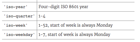 Waar we dit voorheen met een redelijk complexe berekening moesten oplossen, kunnen we met de komst van Tableau 2018.2 gebruikmaken van ISO 8601 date parts. In de afbeelding hieronder zie je welke functies je kunt gebruiken in je calculaties.