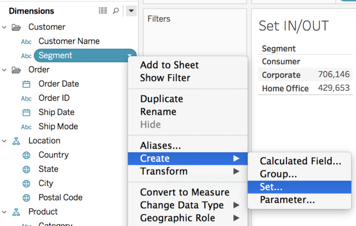 Om een set te maken, klik je met je rechtermuisknop op een dimensie in je data pane en ga je naar Create > Set.