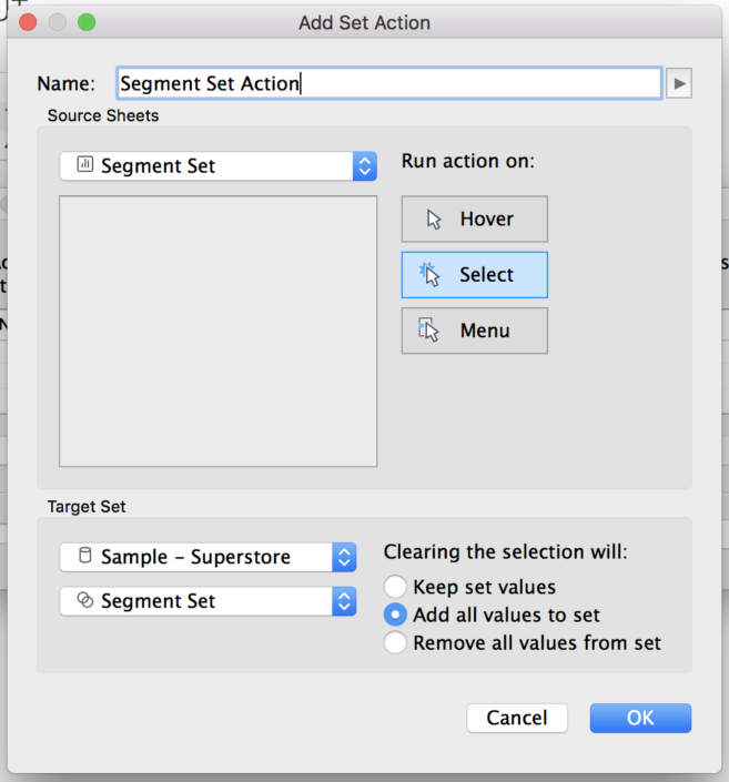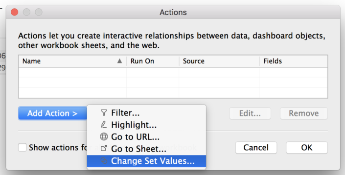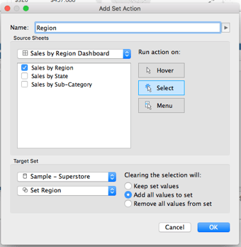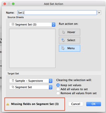 Om een set action te kunnen creëren, moet de dimensie waarop de betreffende set is gebaseerd aanwezig zijn in de source worksheet. Als dat niet het geval is, geeft Tableau aan dat er een veld mist.