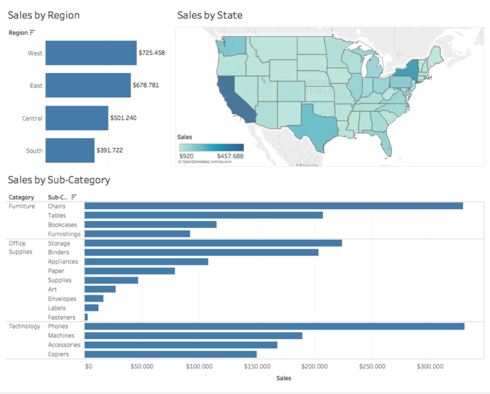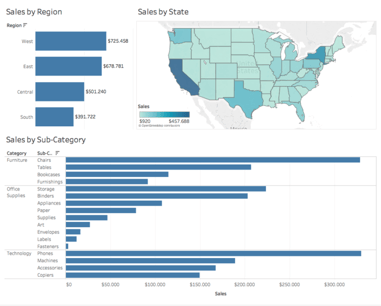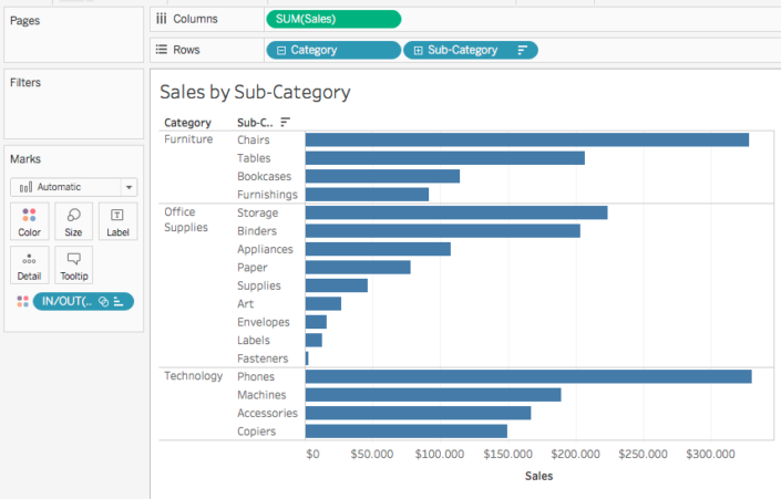 - Op de sheet “Sales by Sub-category” worden de bars gedeeltelijk grijs gekleurd. Het deel van de bar dat blauw blijft, is het deel van de Sales dat gegenereerd wordt door de aangeklikte regio (ofwel, de regio die IN de set valt).