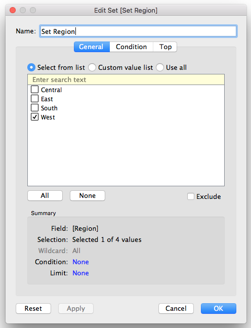 In de dialog box die volgt, definieer je welke waarden in de set moeten vallen. Selecteer de waarden handmatig in de lijst of vul je set dynamisch met de tabbladen “Condition” en “Top” (bijvoorbeeld top 2 op basis van “Quantity”).