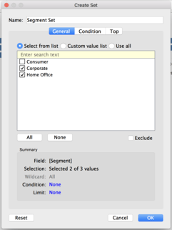 Ik heb in dit voorbeeld handmatig de waarden “Corporate” en “Home Office” aangevinkt. Klik op “OK” en je ziet dat de nieuwe set is toegevoegd onder het kopje “Sets” in de data pane.