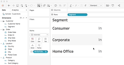 Bovenstaande set action “Segment Set Action” heb ik geactiveerd op de worksheet zoals te zien aan het begin van deze blog (“Segment” op de Rows shelf en de betreffende set op Text). In het gifje hieronder zie je hoe op die sheet de waarden “In” en “Out” veranderen afhankelijk van de regel die ik aanklik.