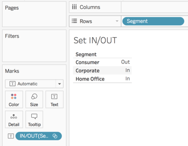 Nu kun je deze set net als elk ander veld gebruiken in je visualisaties. Sleep de set naar de Columns shelf, Rows shelf of Marks Card of gebruik ‘m in een calculatie. Hieronder zie je “Segment” op Rows staan en de gemaakte set op Text. De tabel geeft precies aan welke waarde binnen de set valt en welke erbuiten.