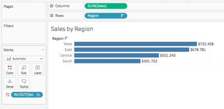 Sheet 1: Plaats Sales op Columns en Region op Rows. Sleep de set op Color. Sorteer de bars in descending volgorde.