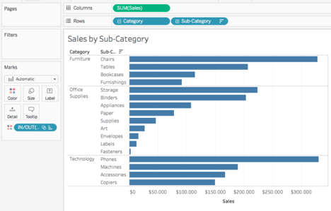 Sheet 2: Plaats Sales op Columns, Category en Sub-Category op Rows. Sleep de set op Color. Sorteer de bars in descending volgorde.