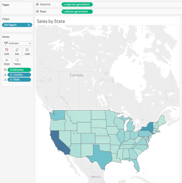 Sheet 3: Dubbelklik op Country en State zodat er een kaart wordt gegenereerd. Plaats de set in de filter box en sleep Sales op Color.
