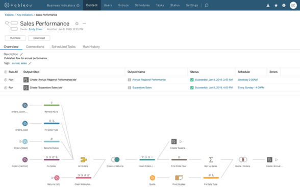 Waar je met Tableau Prep Builder (de nieuwe naam voor Tableau Prep) je data in de juiste vorm voor analyse brengt, zorg je er met Tableau Prep Conductor voor dat je de juiste data op het juiste moment beschikbaar maakt. Zodra je een flow gebouwd hebt, kun je deze publiceren op de server. Vanuit daar kun je je flow plannen, delen en beheren.