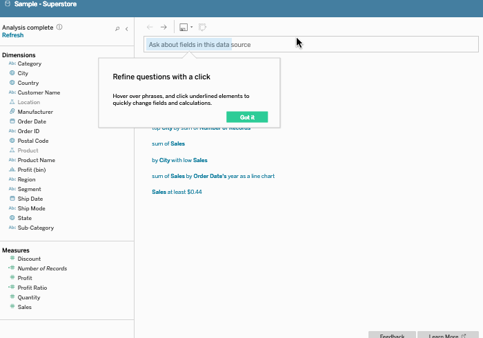 Op basis van statistische kennis over de data source en eerdere interacties met die data, interpreteert Tableau de gestelde vraag. Als je vraag niet duidelijk genoeg is, doet Tableau suggesties om deze te specificeren. Input nodig voor het formuleren van je vraag? Hoover dan eens over de velden in de data pane. Een tooltip verschijnt en je ziet direct de meest voorkomende waarden.