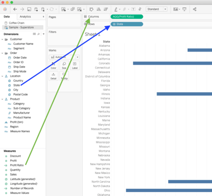 The next step is to open a new sheet and within that sheet selecting the datasource ‘Sample Superstore’, dragging the field “Profit Ratio” in the Columns shelf and “State” in the Rows shelf, and this creates a bar chart. They click around and change the visualisation from Automatic to a Gantt Bar (for reasons they don’t explain) and decide to turn it back to Automatic. In my experience as a trainer, this is irrelevant during this specific topic and might confuse the students. Although it is not wrong per se.