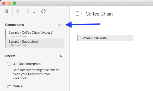 The Example – The first datasource is already created, with a connection to Coffee Chain (a well known example dataset provided by Tableau). Within this datasource they tell us to click on the ‘Add’ button next to Connection to connect to Sample Superstore and create a second Datasource.