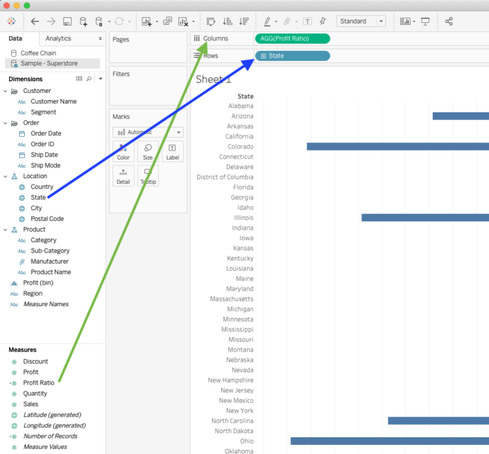 The next step is to open a new sheet and within that sheet selecting the datasource ‘Sample Superstore’, dragging the field “Profit Ratio” in the Columns shelf and “State” in the Rows shelf, and this creates a bar chart. They click around and change the visualisation from Automatic to a Gantt Bar (for reasons they don’t explain) and decide to turn it back to Automatic. In my experience as a trainer, this is irrelevant during this specific topic and might confuse the students. Although it is not wrong per se.