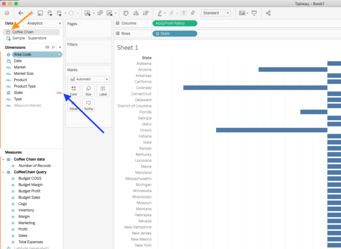 After doing this, they finish the exercise by saying something similar to: “This now shows the Profit Ratio by State for both Superstore and Coffee Chain”.