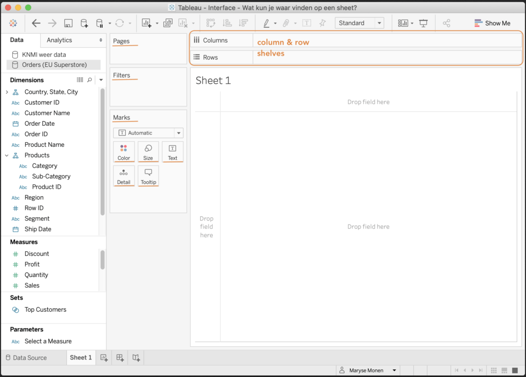 Je hebt een columns shelf en een rows shelf, als je weet welk veld je wil gebruiken kun je ook direct beginnen met typen op de shelves. Shelves worden soms ook wel cards genoemd. Daarnaast heb je nog de pages, filters en de marks card. Alle shelves, en cards kun je eventueel van positie veranderen, bij een nieuwe sheet of workbook zijn deze aanpassingen weer ongedaan gemaakt.