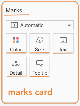 De marks card is opgebouwd uit verschillende onderdelen, shelves, welke ieder weer velden kunnen bevatten. Dit zijn onder andere color, size, label, detail en tooltip. Daar kan op geklikt worden om vervolgens de kenmerken aan te passen. Ook heb je mark type, deze staat normaal op automatic. Je kan deze bijvoorbeeld aanpassen naar bar, line of shape, hierdoor kunnen de shelves op de marks card aangepast worden. Afhankelijk hoe de view is opgebouwd, kun je meerdere marks cards hebben, één voor elke measure.