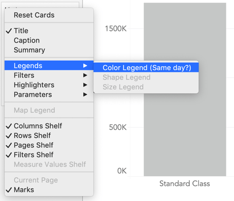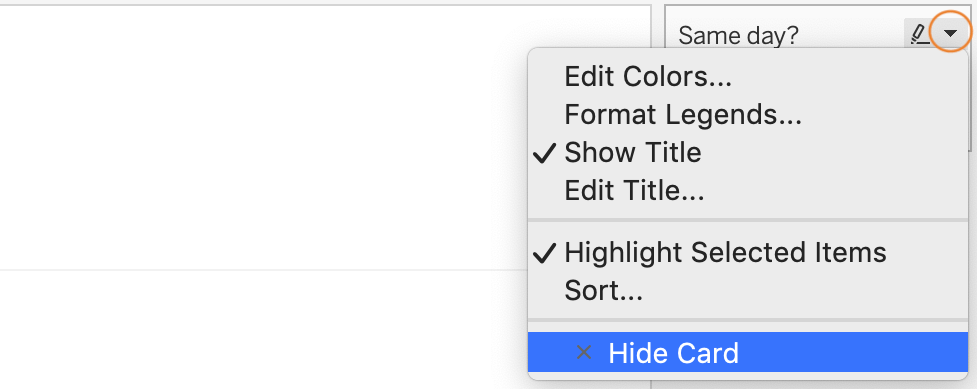 Er wordt automatisch een legenda (legend) getoond rechts op het scherm wanneer er een veld wordt geplaatst op color, size of shape op de marks card. Wanneer je rechts naast de titel van de legenda klikt, kun je kiezen voor de optie hide card om de legenda niet meer te tonen.