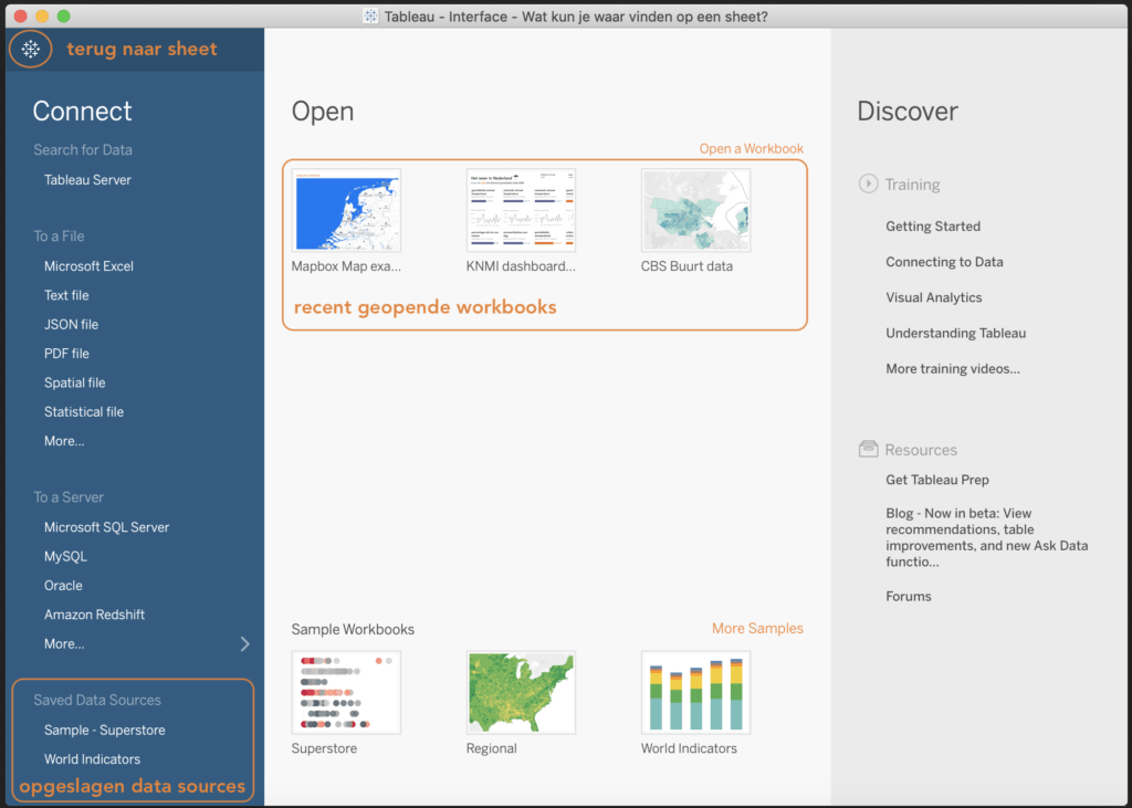 Wanneer je op het logo links klinkt, ga je naar het startscherm. Hier kun je opgeslagen data sources zien, recent geopende workbooks en meer. Om terug te gaan naar de sheet klik je weer links bovenin.