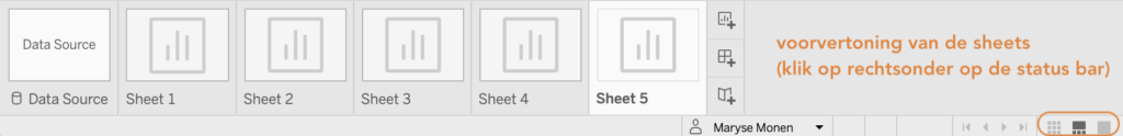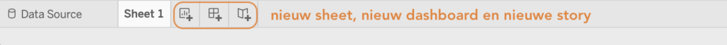 Beneden in het scherm kun je de tabs vinden om nieuwe sheets te maken. We kunnen sheets, dashboards en stories maken met deze tabs. Ook kun je de sheets hernoemen, dupliceren, de formatting kopiëren en nog vele andere dingen. Rechtsonder kun je scrollen tussen de verschillende tabs.