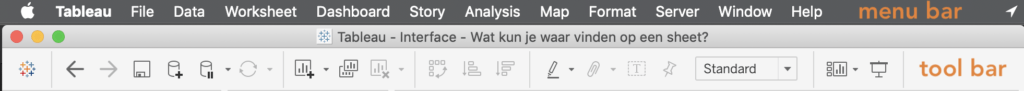 Onder de menu bar is de tool bar te vinden, met knoppen zoals save en undo, opslaan en annuleren. Er is geen automatisch opslaan in Tableau, dus het is belangrijk je werk regelmatig op te slaan. Afhankelijk van of er iets op de sheet staat zullen deze buttons beschikbaar zijn.