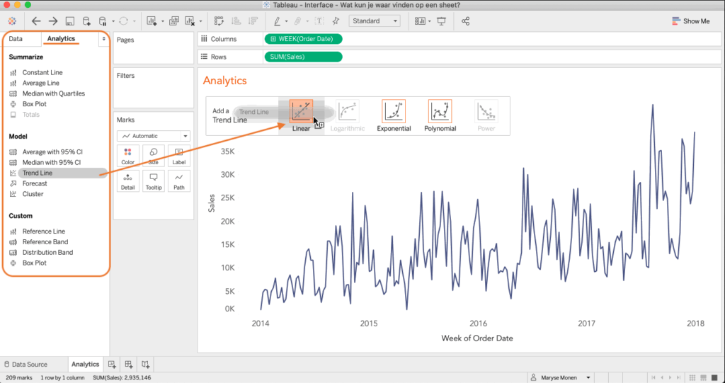 Wanneer je klikt op de analytics tab (naast de data tab) kun je een aantal statistische analyses in de view slepen. Alleen de relevante buttons zijn beschikbaar. Dit zijn bijvoorbeeld, forecast, box plot, average line en trend line. Wanneer je bijvoorbeeld een trendlijn kiest, kan je het type trendlijn kiezen en om welke measure het gaat.