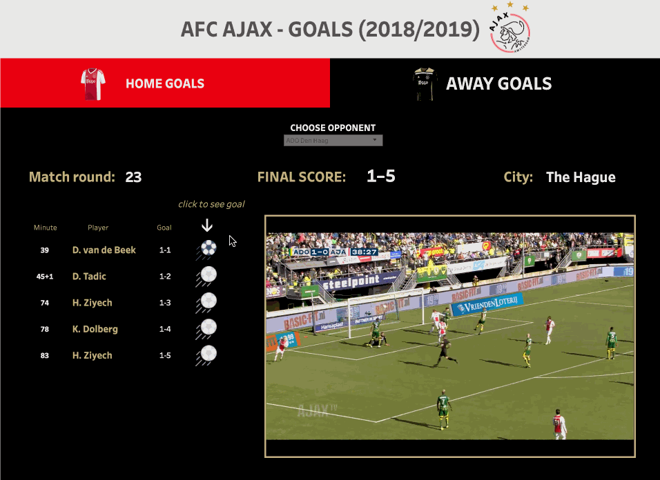 Last season Ajax scored 119 goals in the Eredivisie, which were the most goals scored by any Dutch team that year. As an Ajax fan myself, this was the perfect topic to make a dashboard about. I could expand my Tableau skills, while at the same time getting to enjoy all the goals again.