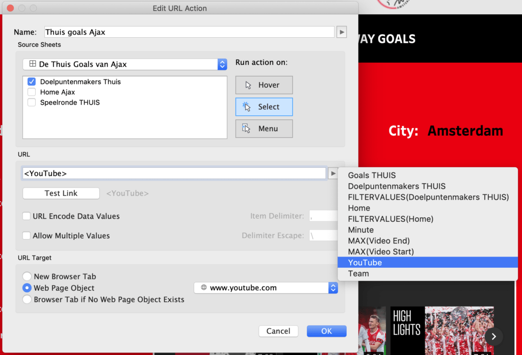 - In the settings window you choose the field you want to control the URL action with. I chose Doelpuntenmakers Thuis (‘Players that scored at home’). I want to run the action on Select; by clicking on it.