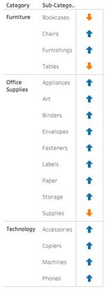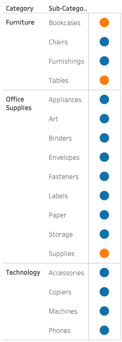 Let’s say we build an overview in which we show, by use of colour, if a certain Sub-Category is doing well (Green) or is not doing well (Red).