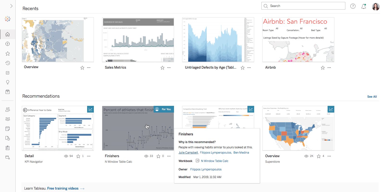 Dit zijn gepersonaliseerde suggesties die je direct verbinden met relevante gegevens en inhoud op jouw Tableau site. Aangedreven door machine learning, komen deze aanbevelingen overeen met voorkeuren van gebruikers, waardoor inhoud wordt weergegeven die anderen zoals jij interessant of nuttig hebben gevonden, inclusief wat het meest populair en recent is.