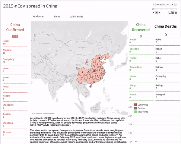 To see the difference in action, I’ve made a Corona virus dashboard which shows the spread of the virus around the world with a zoom on China and the US. The dashboard itself doesn’t have the play button at this time but if you compare it to the gif attached below, you can sense the difference between having to slide and click or simply starting the animation.