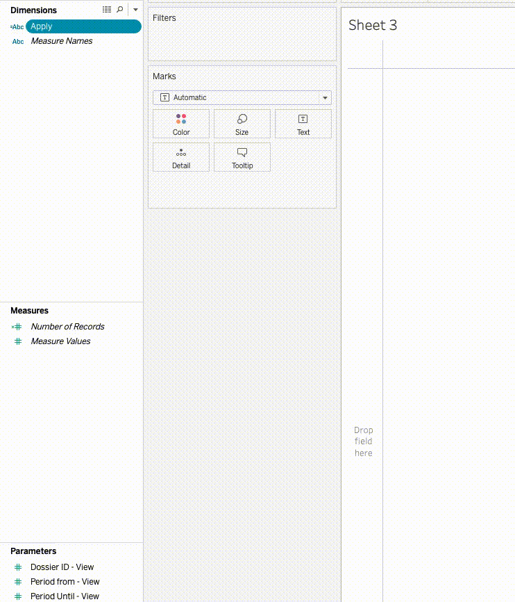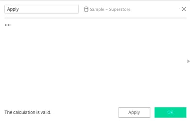 4. Maak op dit nieuwe worksheet een Calculated Field genaamd Apply en vul deze enkel met “”