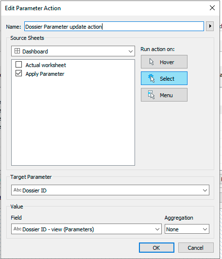 - Maak een Change Parameter action aan (Dashboard -> Action)