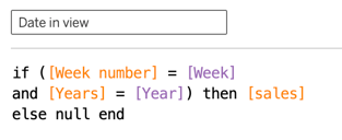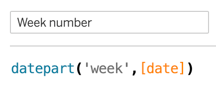 Firstly, we will need to create a calculated field that returns all the week numbers available in a year. Let’s call it “Week number” and use the following formula: datepart(‘week’, [insert date field name]). This field will return an integer.
