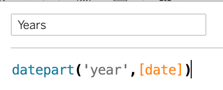 - Create a “Years” calculated field (similar to the “Week number” calculated field):