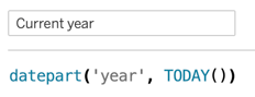 2. Create a “Current year” calculated field (similar to the “Today’s week” calc):