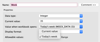 - At last, next to “Value when workbook opens” on the upper part of the parameter settings, click on the arrows to open the drop down, and select “Today’s week”. This will make sure that the parameter will always be set to the current week when the workbook opens:
