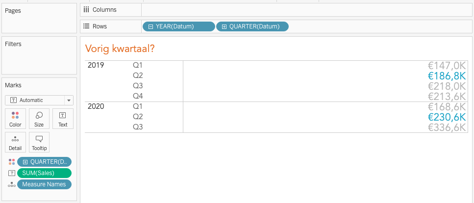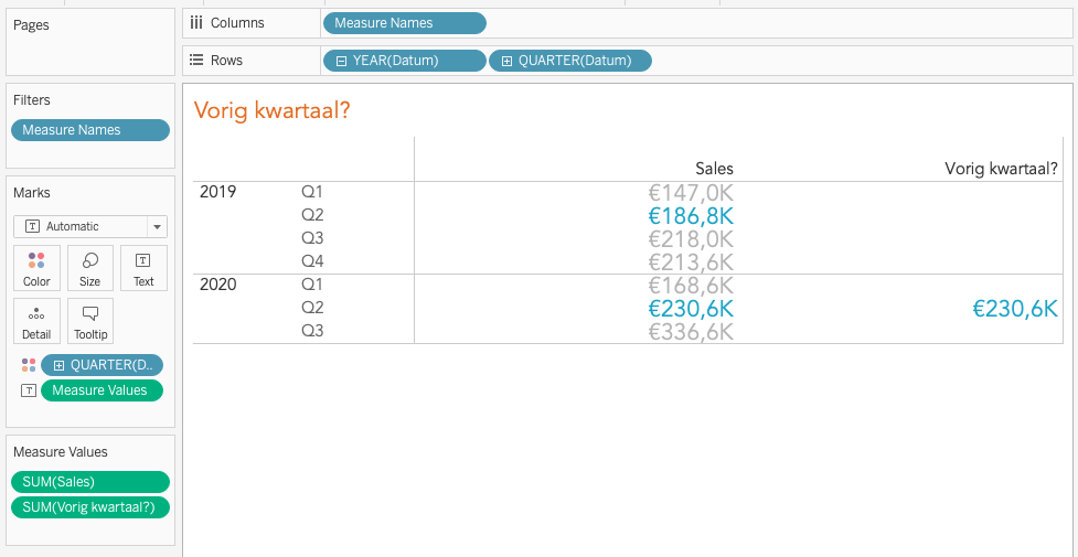Nu kun de calculatie gebruiken waarbij je het vorige kwartaal hebt geïsoleerd, zonder gebruik te maken van een filter. In mijn volgende blog lees je hoe je deze calculatie kan inzetten om vervolgens de YoY te berekenen.