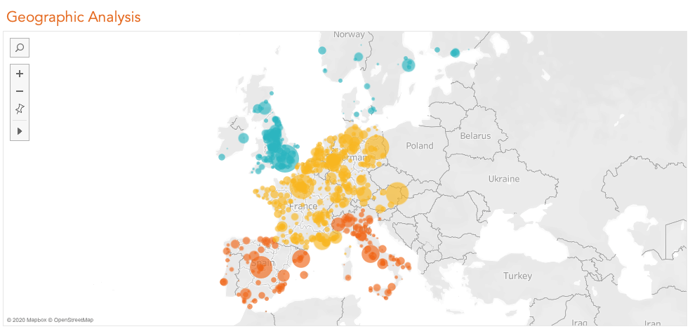 Natuurlijk kun je zelf al met verschillende lettertypen of kleuren werken op je kaart, zoals de afbeelding hier boven. Je kunt verschillende kaartlagen weergeven, maar ook een andere achtergrond kiezen. De satelliet achtergrond ziet er al snel indrukwekkend uit, zoals in dit onderstaande workbook: