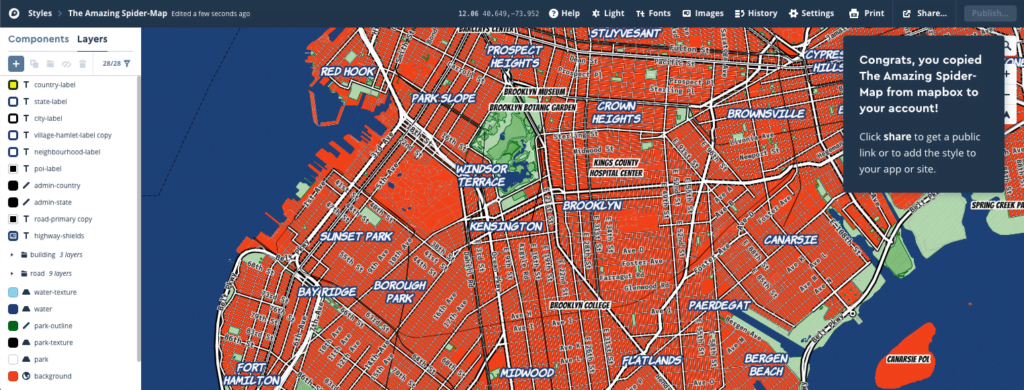 Nadat je een Mapbox account hebt aangemaakt klik je op deze link om de Spider-Map toe te voegen aan je Mapbox studio. Vervolgens wordt de kaart toegevoegd aan je studio en zie je de volgende afbeelding: